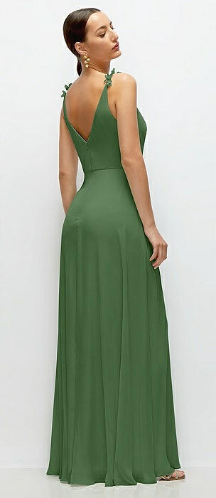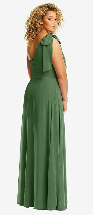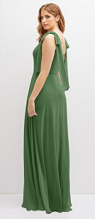 Bow-Shoulder V-Back Chiffon Gown with Front Slit in vineyard green
