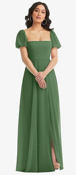 Puff Sleeve Chiffon Maxi Dress with Front Slit in vineyard green
