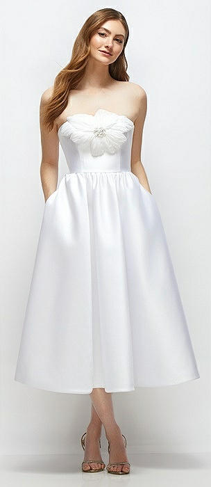 Strapless Satin Midi Dress with Handmade Flower & Horsehair Hem in white