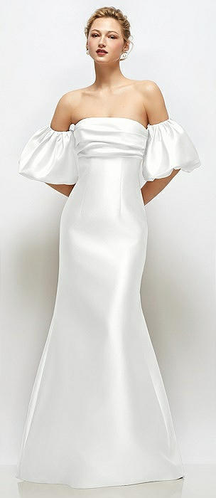 Off-the-Shoulder Puff Sleeve Satin Maxi Dress with Flared Skirt in white