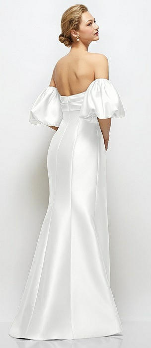 Asymmetrical Bow Off-Shoulder Satin Gown with Ballroom Skirt in white