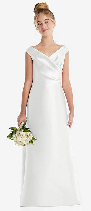Off-the-Shoulder Draped Wrap Satin Junior Bridesmaid Dress in white