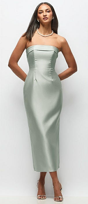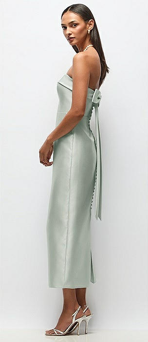 Strapless Cuff Satin Midi Dress with Column Skirt & Back Bow in willow green