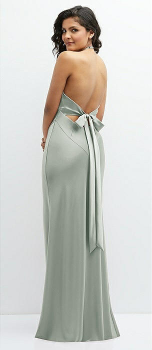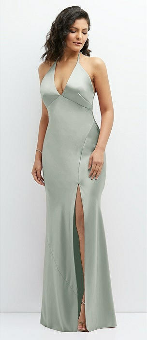 Plunge Halter Open-Back Maxi Bias Dress with Low Tie Back in willow green