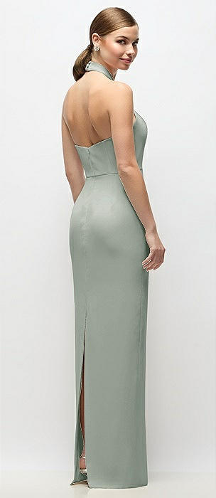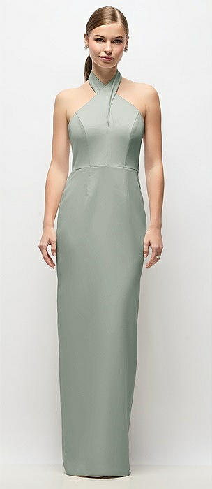 Criss-Cross Halter Open-Back Crepe Column Maxi Dress in willow green