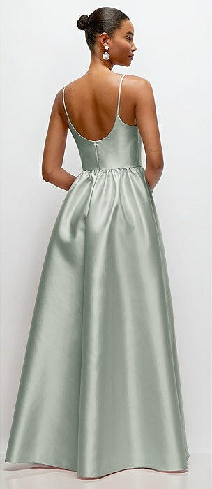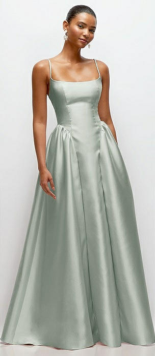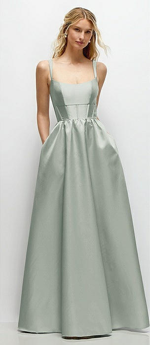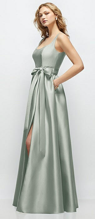 Scoop Neck Drop Basque Skirt Satin Maxi Dress with Pockets in willow green