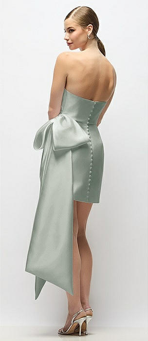 Strapless Pleated Draped Satin Mini Dress with Dramatic Long Tail Bow & Covered Buttons in willow green