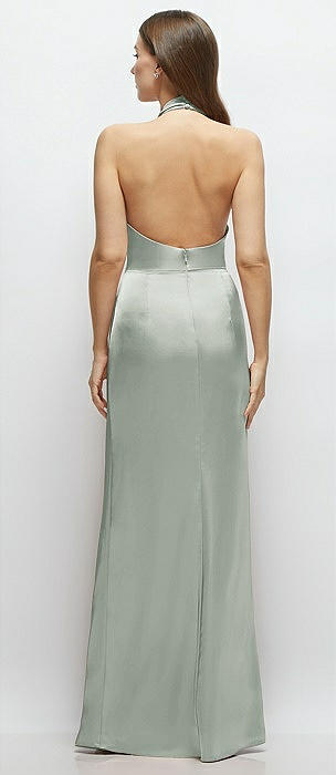 High Halter Tie-Strap Open-Back Satin Maxi Dress in willow green
