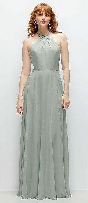 High-Neck Halter Chiffon Maxi Dress with Adjustable Spaghetti Straps in willow green